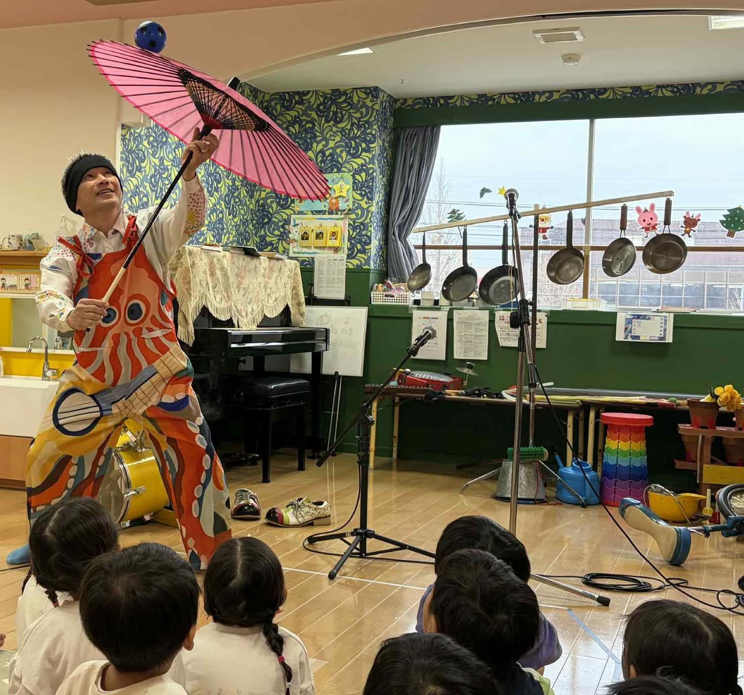 福岡市の保育園で「新春ショー」を開催。ガラクタ音楽会・ワンマンバンド・和芸・獅子舞で1時間のパフォーマンス。
